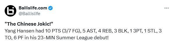 美媒盛赞杨瀚森:“中国约基奇”!首秀23分钟拿下10分5助4板3帽
