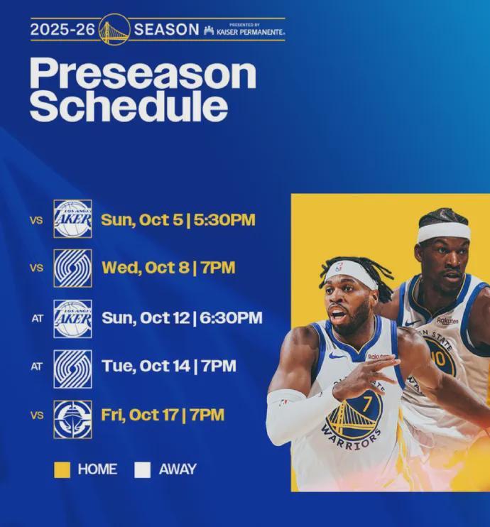 勇士公布了25-26赛季季前赛的赛程,北京时间如下: